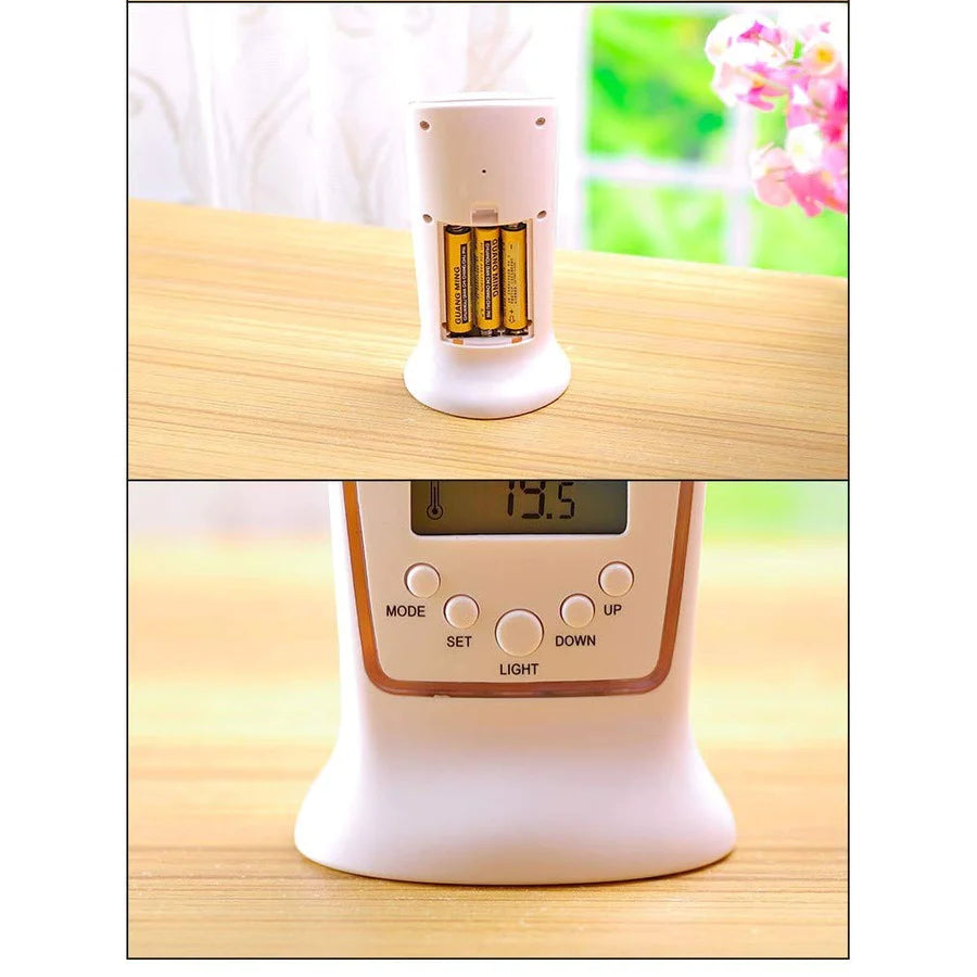 - Digital thermometer Date, month, day, temperature, alarm display Alarm with music