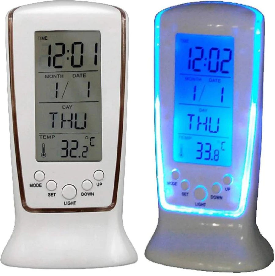 - Blue LED backlight LCD clock with calendar