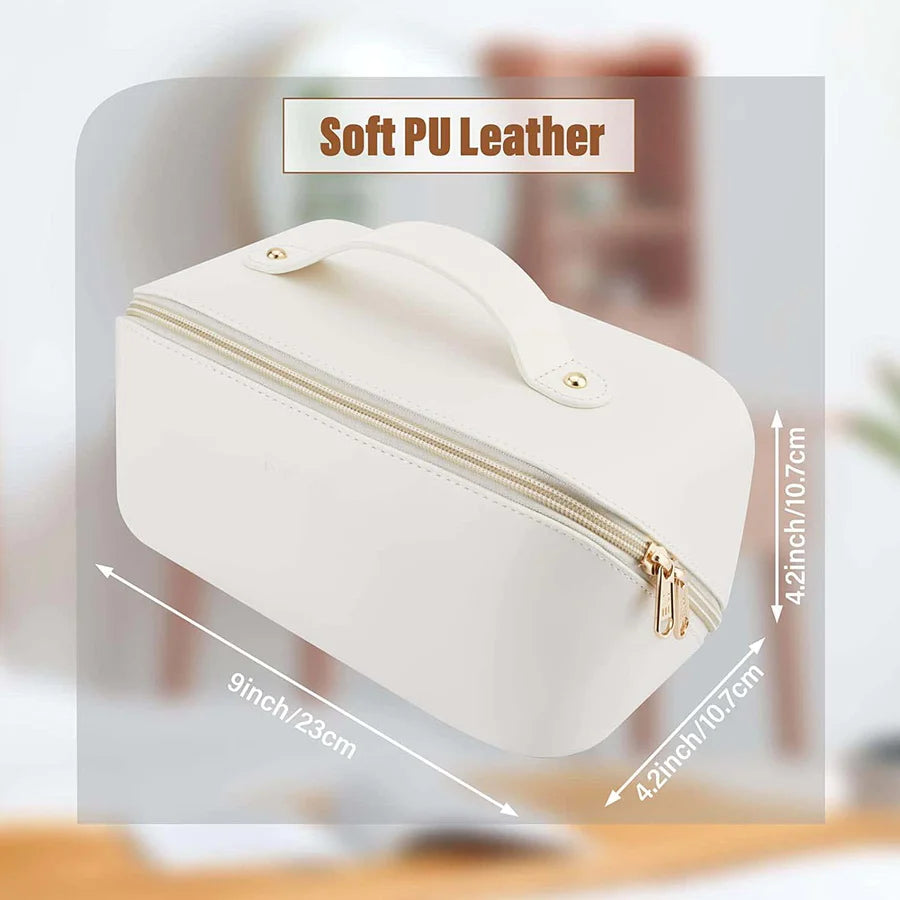 - HIGH QUALITY MATERIAL: The Upgrade of Superior PU Leather,this Makeup Bag is easy to clean and Waterproof surface,and the shape of the toiletry bag will be more three-dimensional;The middle of the compartment at the bottom added Velcro that more helpful for storage and organizing;The thicker Inner lining,much more durable than similar products.