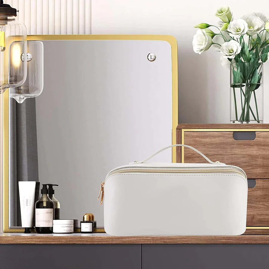 - CLEAR & EASY ACCESS: The large open mouth and lay-flat design of our makeup travel organizer provide a clear at-a-glance view of your items, saving you time when you need it most. The easy double zipper access enhances your makeup experience and keeps messes at bay. Its premium fabrics, smooth metal zippers, and heavy-duty design lend this travel makeup bag a touch of elegance and durability.