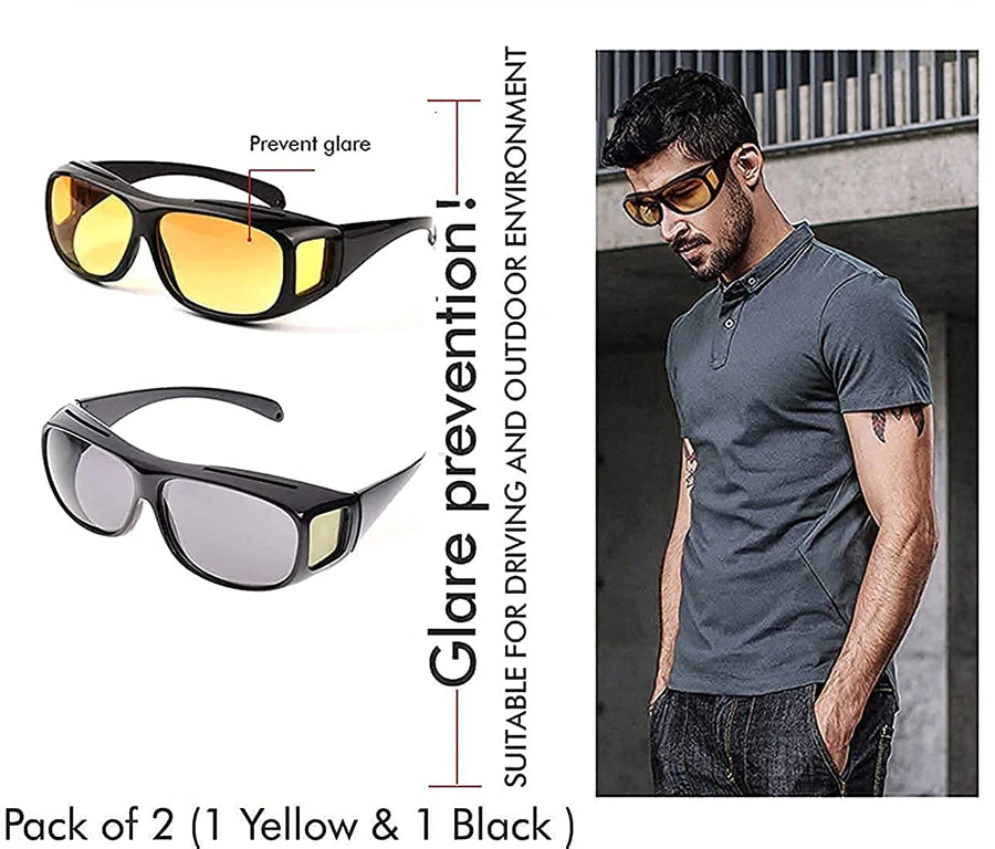 Brand New and Good Quality Color: Yellow black Material: Plastic Size: As picture showed Side Protect Design Feature: HD Vision technology gives you clarity that you have never experienced With side lens for improved peripheral vision Great for Low Light & Foggy Conditions Black Frame with Yellow Lens Light weight & durable A Yellow Lens Night Driving Sunglasses to "fit over" for your prescription eyeglasses, 63mm size will fit over medium to large prescription glasses. Check measurements for verification. This sunglass can wear/put/cover over your RX glasses. It can be worn by itself as well. This sunglass can only see things where there is light. Package Includes: 1x night vision glasses