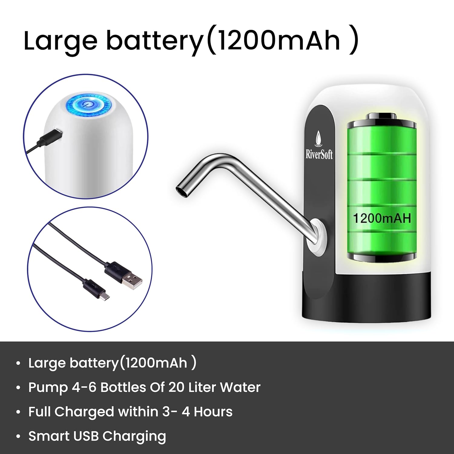 - USB RECHARGEABLE BATTERY (1200 mah) - Built in rechargeable 1200 mah battery and it will take 3-5 hours to charge fully. Used for 30-40 days or it will fill 4-6 20L water bottles, once fully charged