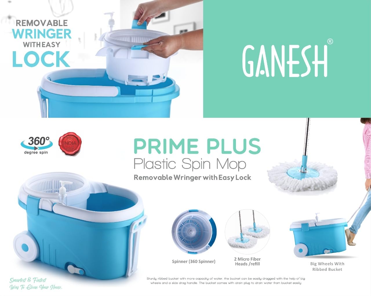 - Easy wheels and puller handle spin mop for floor cleaning, pocha: Easy mop comes with easy wheels and puller to easily carry the bucket around the house. You just need to open the drain spout in order to drain the dirty water.Microfiber power performance for floor cleaning with magic mop: Microfiber material with its unique feature of deep cleaning helps lift and trap fine dust / dirt particles.