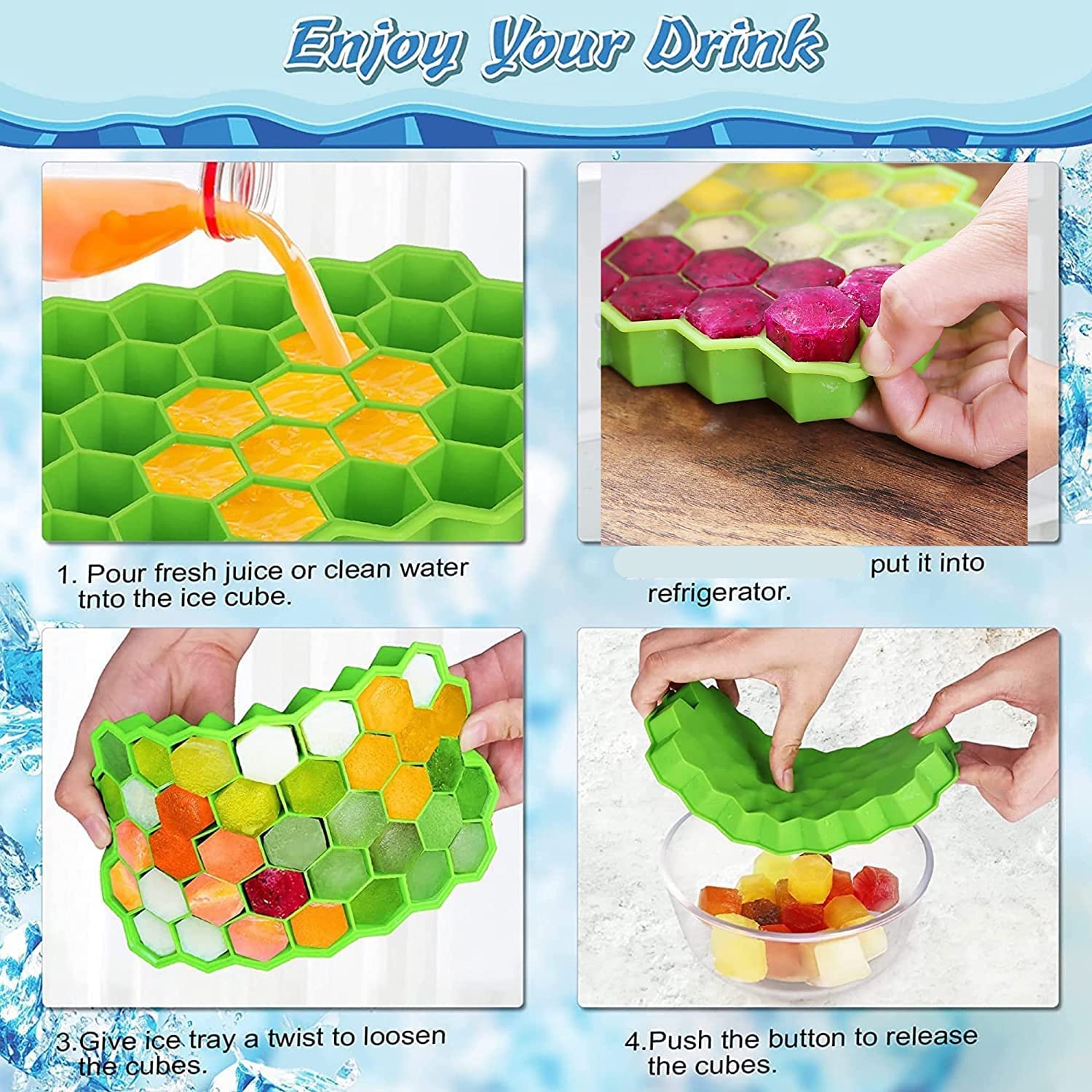 - ✔ Unlike stiff plastic ice cube maker,flexible ice maker silicone ice trays won't crack or break,these silicone ice molds can be easily twisted or pushed from the bottom to remove ice cubes.