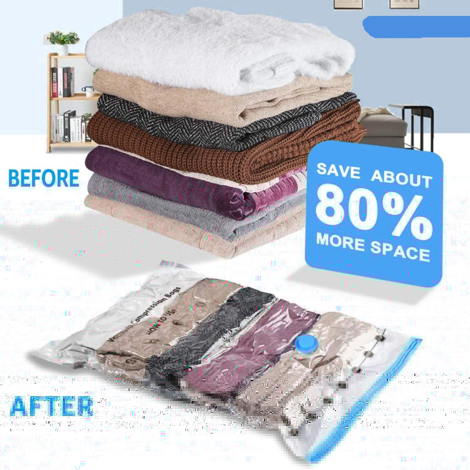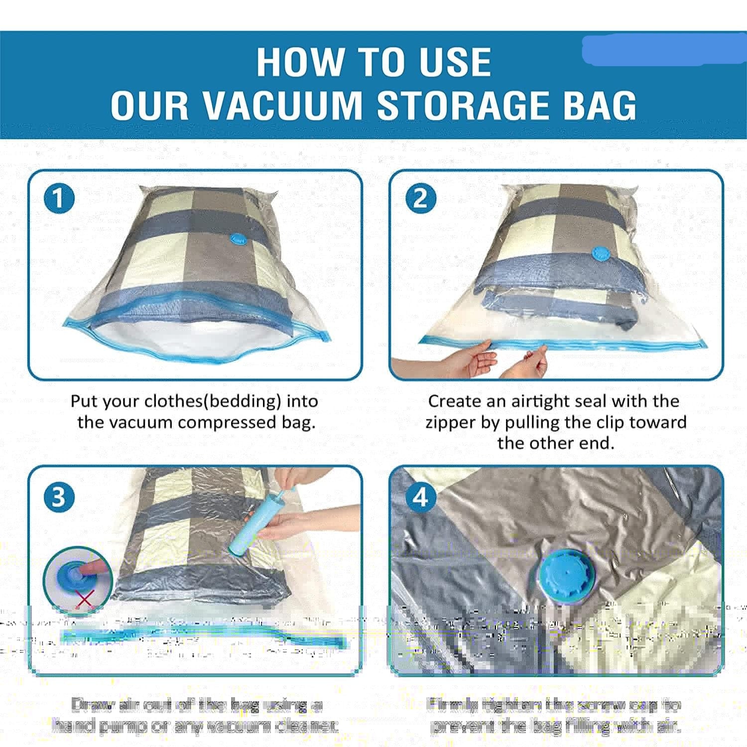 - MULTIPURPOSE STORAGE BAGS: These vacuum bags can be used to store various pieces, including soft toys, rugs, clothes, blankets, quilts, pillows, and extra tight airlocks, ensuring that they stay compressed. You can use these vacuum bags when travelling, and there will be still a lot of space to fit many other things