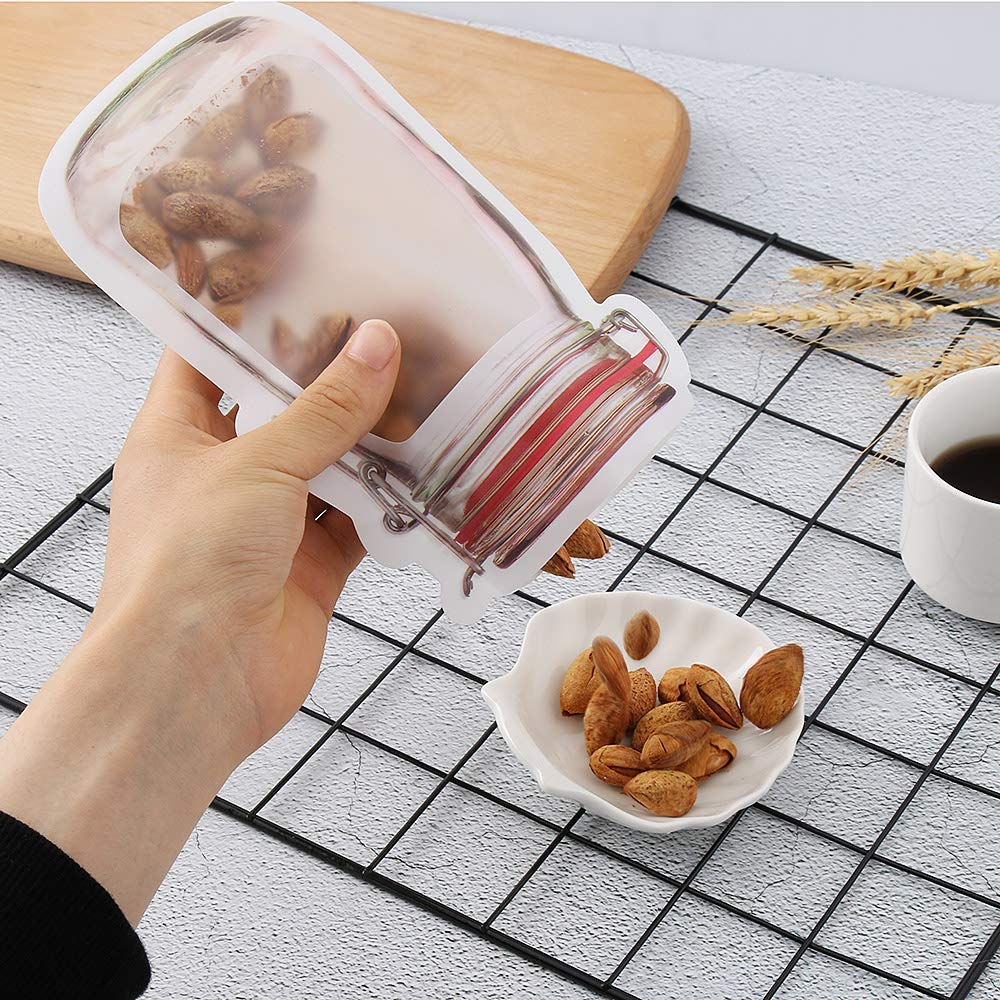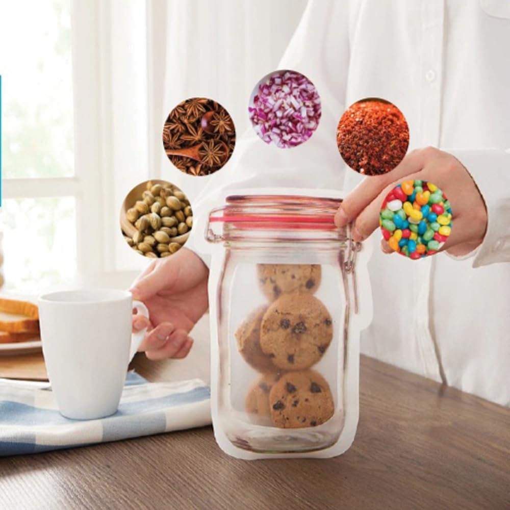 Use them for travel or simply use them for storage at home, the Jar design self sealable and re-sealable pouches are good for packing storing, displaying foods, like nut-fruit, candies, cookies, tea-leaf, dried foods, snacks, etc.Â