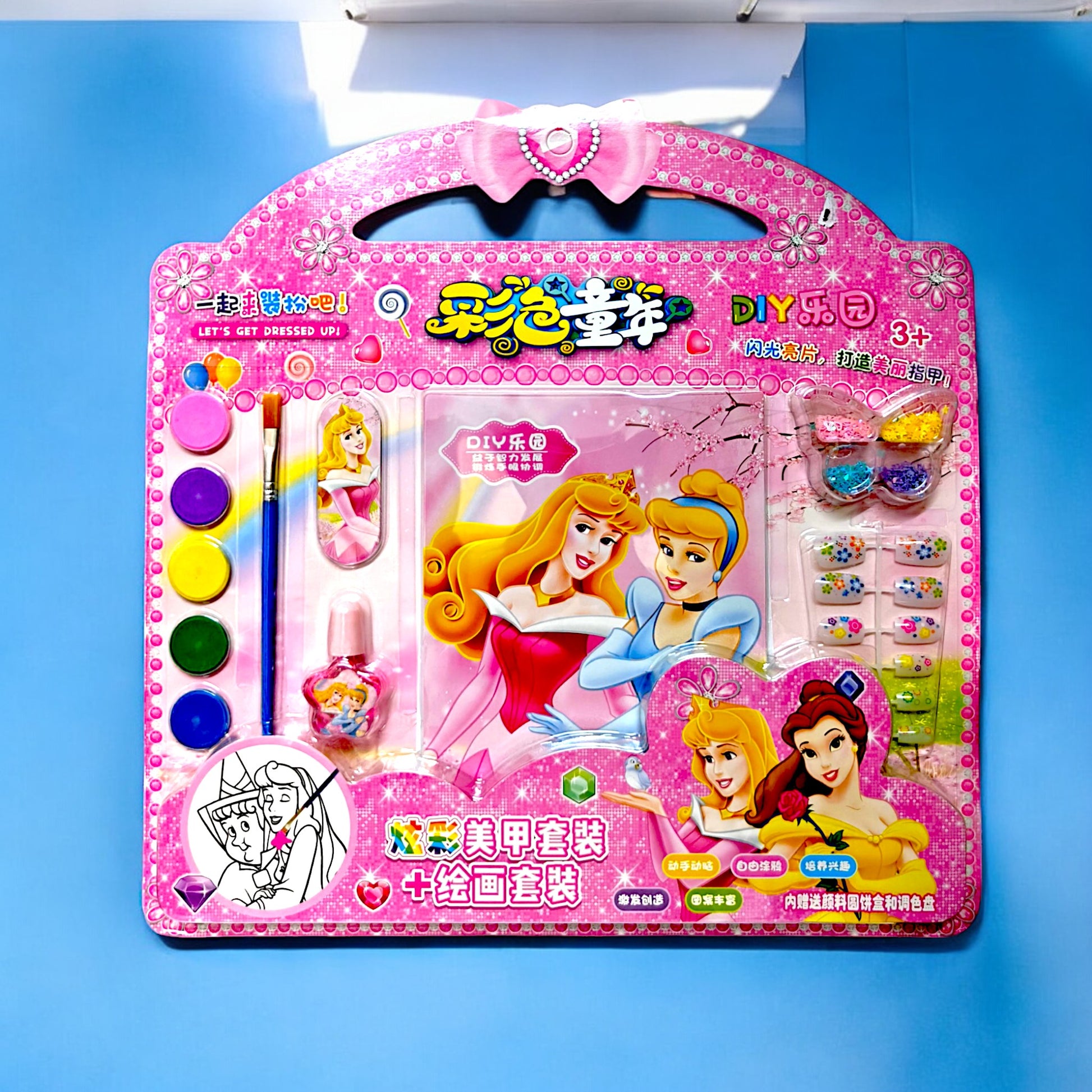 - This Disney Princess gift set comes with 1 stationary set including 2 sticker sheets, 6 coloring utensils, 6 watercolor paints, 1 paintbrush, and 1 coloring and painting book, all in a tote with handle featuring favorite princesses.