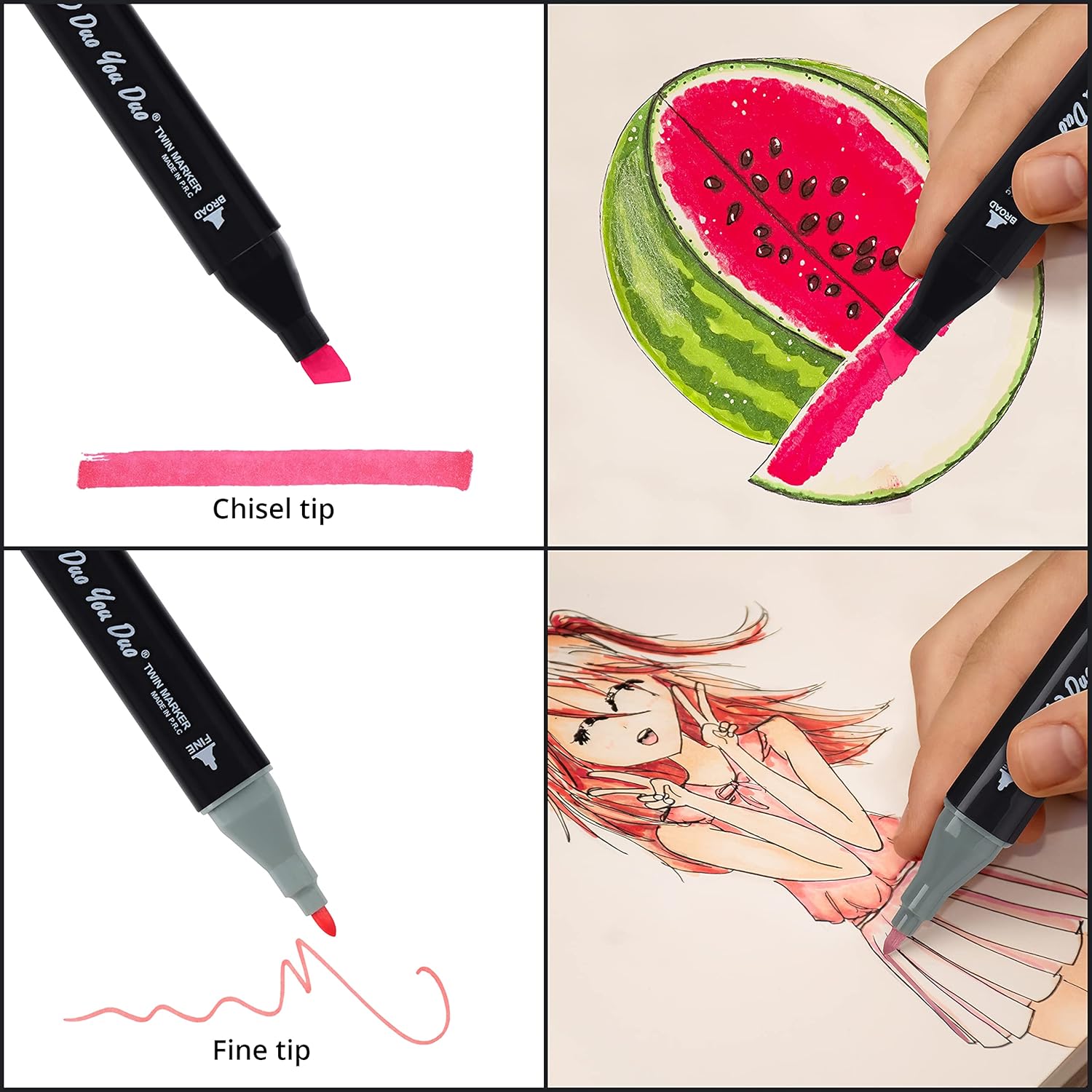 - DUAL BRUSH COLORING MARKERS: Dual tip markers feature both a fine tip and chisel tip which will bring much more fun to your art projects.You can create ultra fine line by 1 mm hard tip,and fine ,medium or bold strokes by a change in brush pressure.