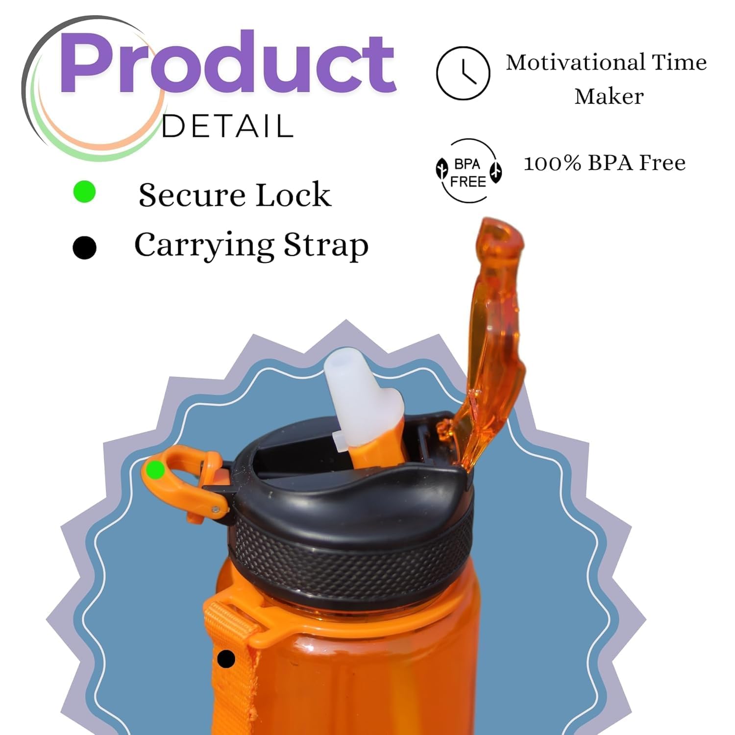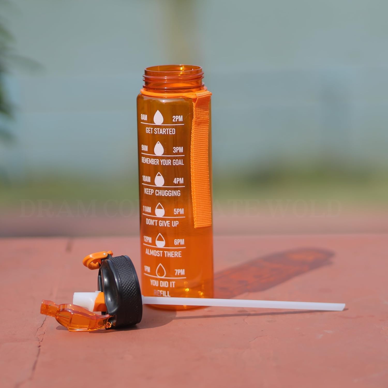 UK-0919 900ML Capacity Belt Straw Transparent Motivational Water Bottles with Time Marker Leak proof & break-proof | Best Usage for Office/School/College/Gym/Travel Bottle | BPA-Free Fitness Sports Bottle
