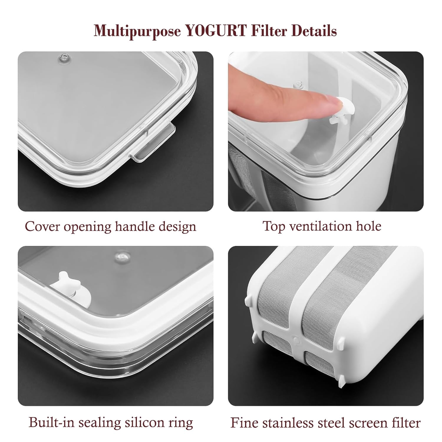 - š§½ Effortless to Use and Clean: Designed for quick operation and hassle-free cleaning, saving busy moms time and energy in the kitchen. To use, pour yogurt into the strainer, cover, and refrigerate. For thick yogurt like hung curd, let it strain for 8 hours, or for Greek yogurt, strain for 3-4 hours using full-fat milk. Check periodically and remove when the desired consistency is reached.