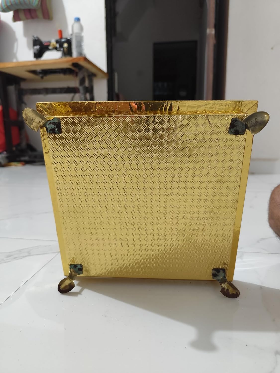 - The golden square design with intricate detailing makes this Pooja Chowki a blend of tradition and beauty for your religious ceremonies. Sturdy & Durable Construction: Made from quality materials, it provide